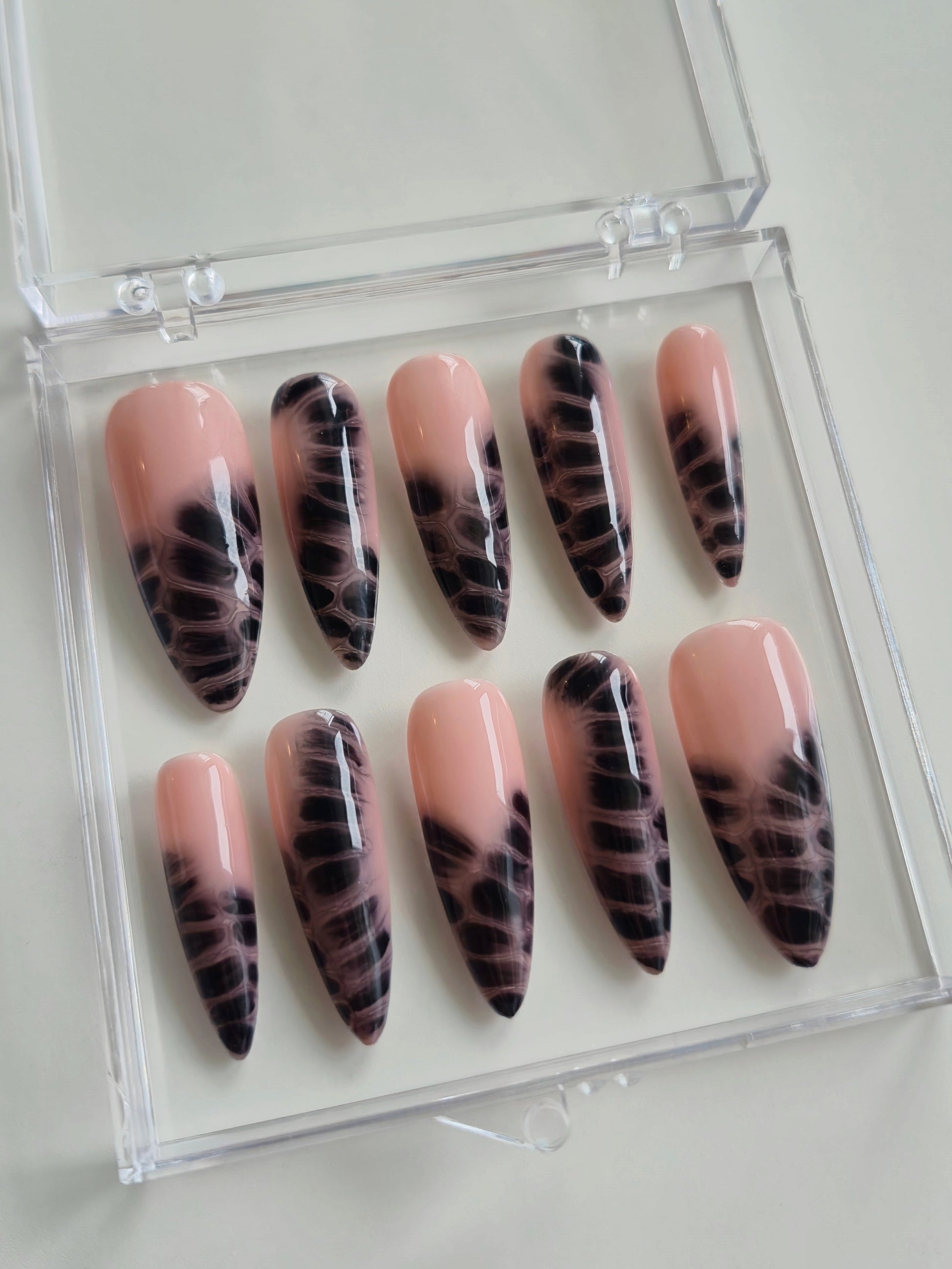 Elke set bevat 10 nagels in een doorzichtig display doosje en een appliciatie kit die alles bevat voor een salon aan huis ervaring.