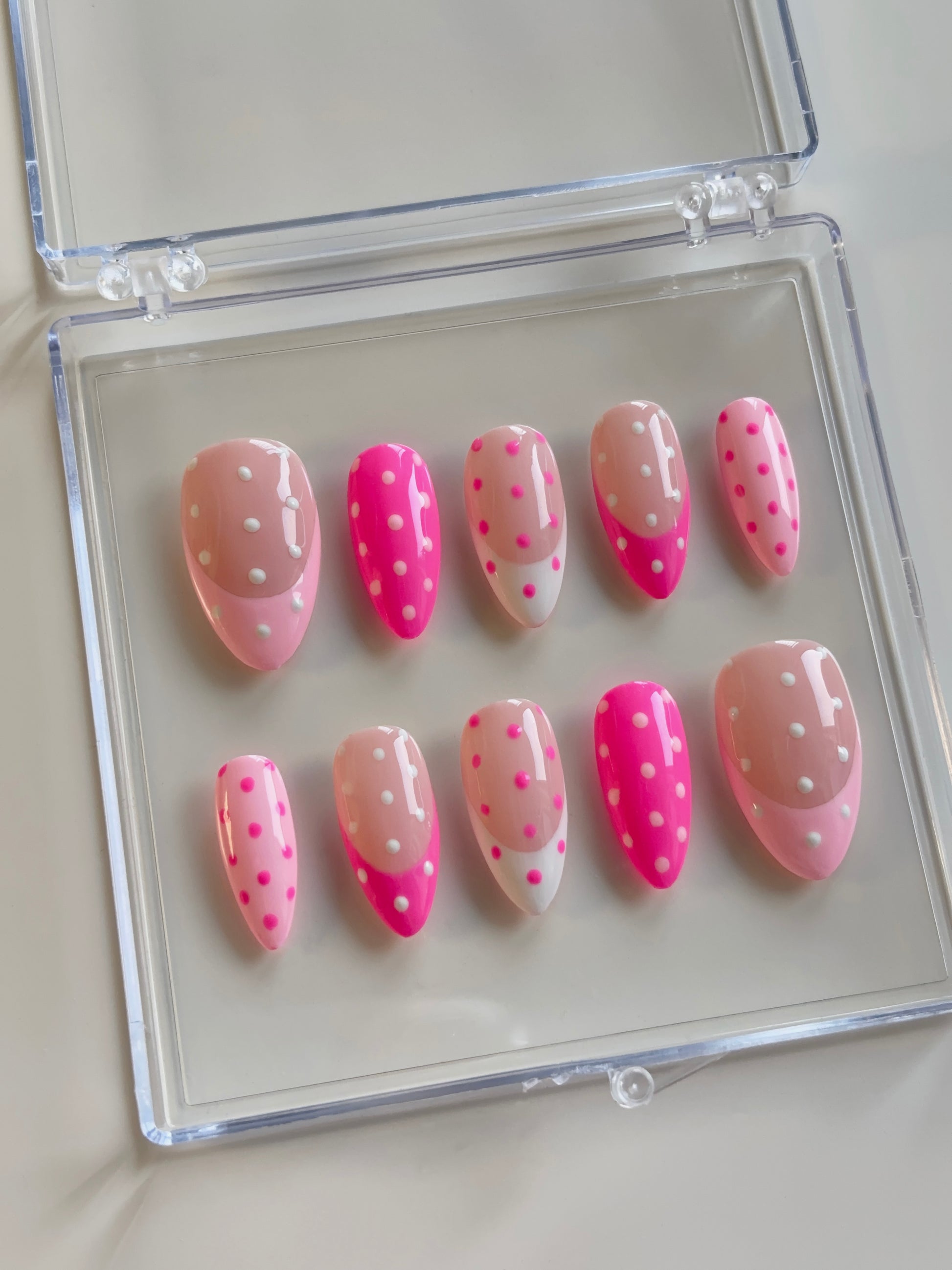 Each set comes with 10 nails in a clear display box and application kit that includes everything for an at home salon experience.